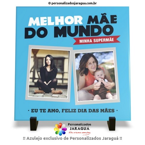Sua Mãe vai adorar saber que você o considera o MELHOR do mundo e que ela é sua Super Mãe favorita. Ideal para o dia das mães :) Nesse azulejo são 2 fotos para você personalizar. Se estiver comprando fora da data, informe que você pode substituir a frase "Feliz dia dos pais..." por outra coisa (aniversário) e dá-lo de presente em qualquer época do ano. Você pode alterar a cor do plano de fundo. Disponível em: azul claro, azul ou rosa (ver galeria).